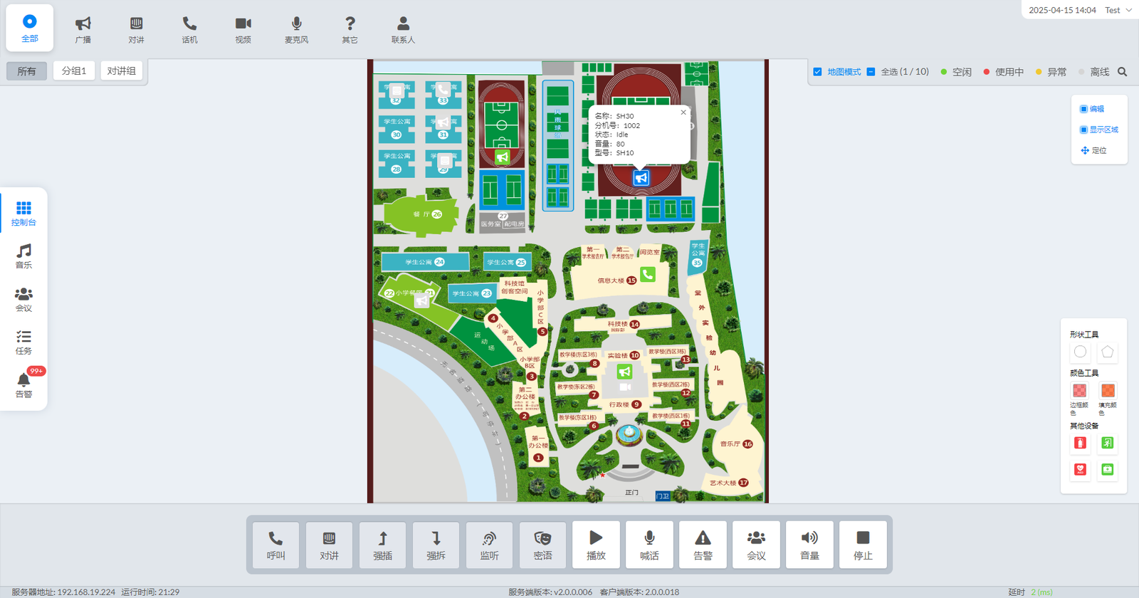 全新升级的SIP融合通信系统引入了电子地图功能,可在地图上实时查看设备位置及状态,对在线设备进行呼叫、对讲、监听等操作。