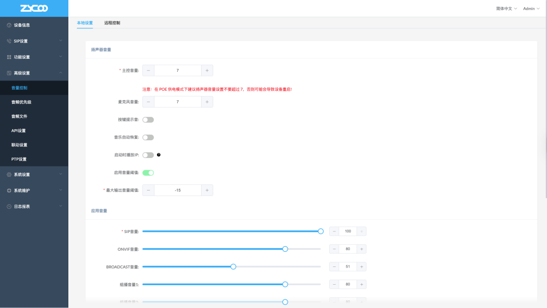 最大输出音量阈值控制增加:在高级设置→音量控制→本地设置界面,增加最大输出音量阈值控制(防止 PoE 供电模式下设备重启)。