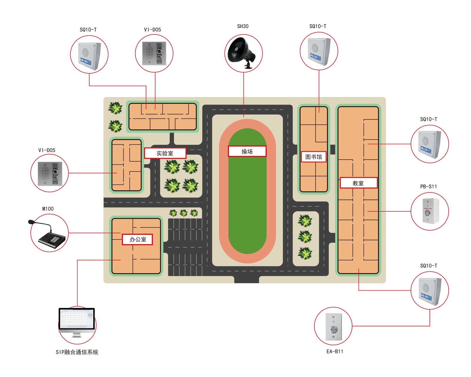 核心设备:SH10网络号角、VI-D05网络对讲