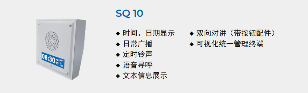 核心设备:SQ10系列方形音箱、EA-B11呼叫按钮配件