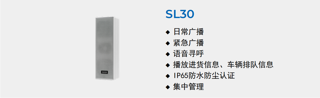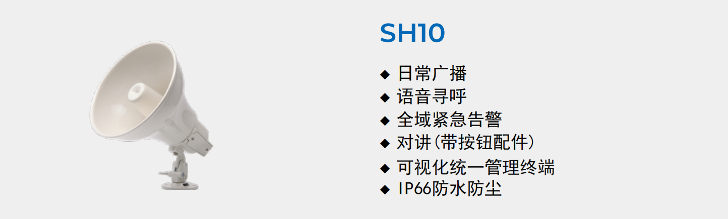 通过部署SH30网络号角、SH10网络号角或SL30网络音柱等设备,可实现日常广播、语音寻呼及应急警报等功能。其中SH10网络号角具备IP66防护等级,防水防尘,坚固耐用,适应恶劣户外环境。