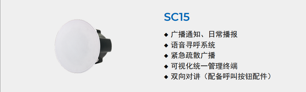 核心设备:SC15网络吸顶音箱、Ei-W05网络安防对讲