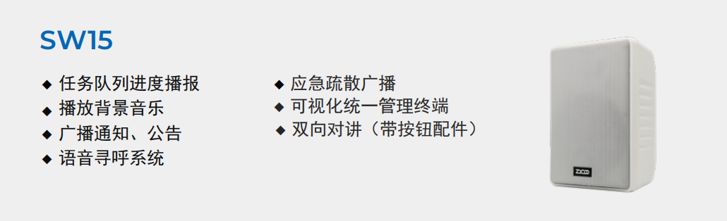 在走廊等过渡区部署SW15网络壁挂音箱,可通过铃声提示作息时间,或引导学生流动。SW15网络壁挂音箱作为高性能网络壁挂音箱,适用于多种广播场景及高保真背景音乐播放。其配备高、低频双扬声器单元,灵敏度高、频响宽,音质清晰饱满、层次丰富。